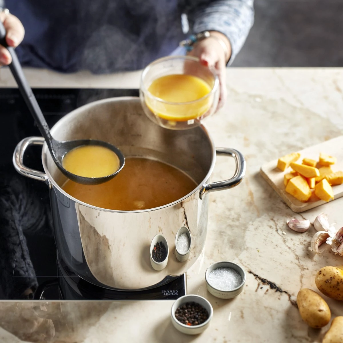 Pompoensoep, kervelcrème, verse kippenbouillon … Deze roestvrijstalen Classico 3 soeppot van 24 cm staat je trouw bij tijdens de bereiding. De bodem verdeelt de warmte vlot en houdt ze goed vast. Op elk fornuis, ook inductie, en zelfs in de oven. Dankzij de maataanduiding binnenin is het extra handig werken met deze pot.
