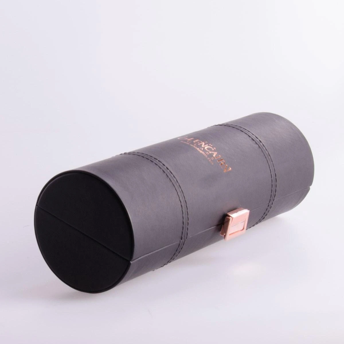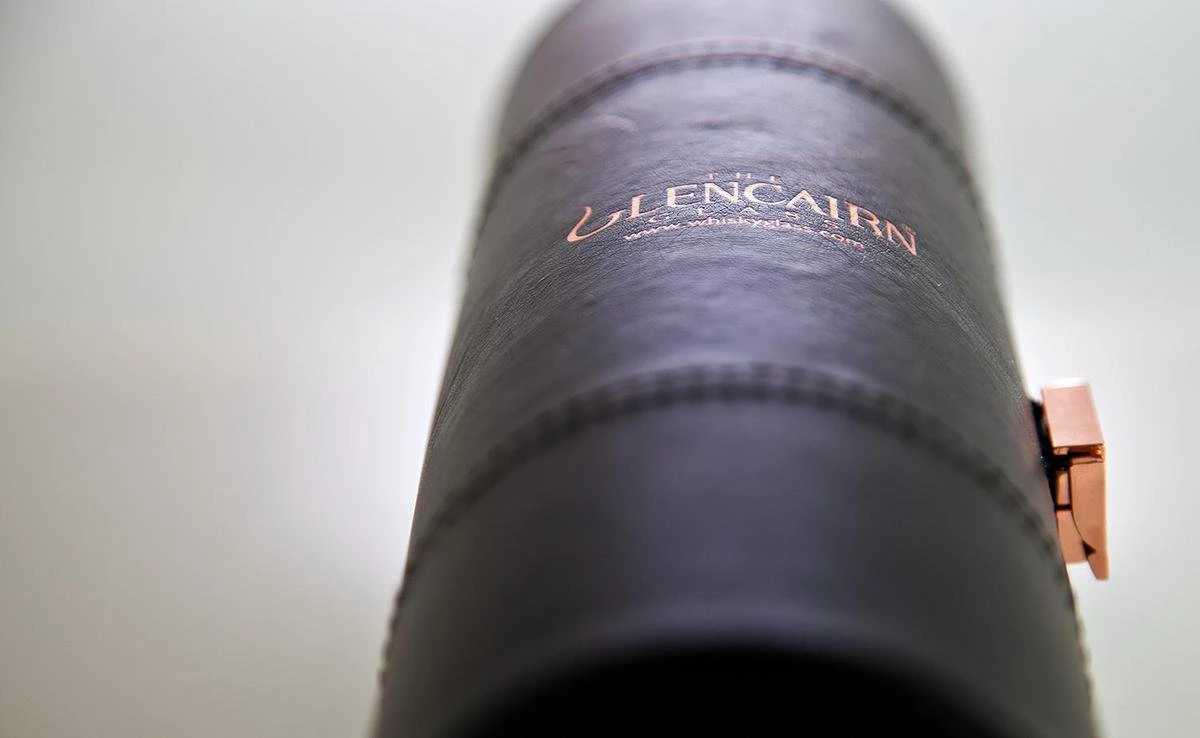 De buitenkant is van mat zwart leer met gestreepte stiksels en voorzien van een bronskleurig Glencairn-logo. De binnenkant is gevoerd in bijpassend suède. Sluiting is door middel van een bronskleurige metalen gesp. Er passen perfect 2 Glencairn glazen in.